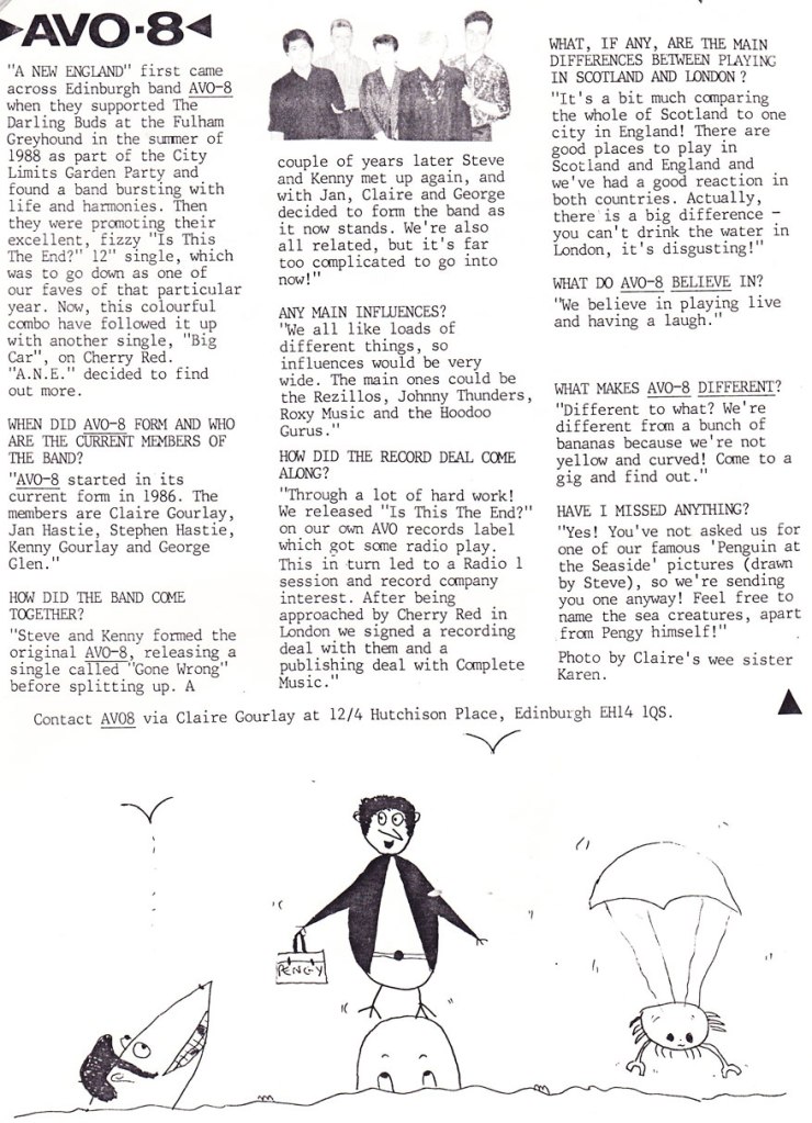 RADIO ONE’S Andy Kershaw turned record-plugger after being seduced by the current, infectious 45 by Edinburgh five-piece AV0-8. Falling for its resounding fusion of the Darling Buds and Girls At Our Best, Kershaw spun ‘IsThisThe End’ on his show and then offered to take copies round to Radio One’s daytime DJs.